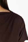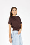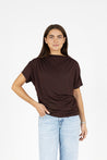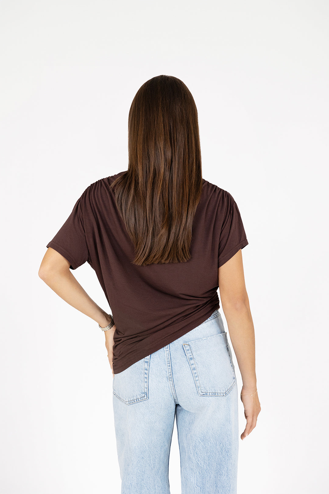 The Emmy Top is fitted around the waist and has a drapy effect at the top. There is stretch in the fabric.