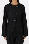 The Phine Blouse has a fitted waist and slightly boxy sleeves. True to size.
